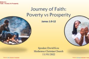 James 1:9-12 – Poverty Vs Prosperity Speaker: David Kou Series: Book of James, Journey of Faith James series of sermons for my church: Matheteuo Christian Church. The Book of James. No 3. Poverty Vs Prosperity Summary: James 1:9-12 – James starts his teaching on trials with the most common problem everyone would face since the…